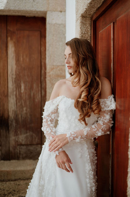 Flavia se construit autour d’un buste en tulle rebrodé floral, travaillé en relief, qui habille la peau avec délicatesse. Le décolleté, dégagé et légèrement arrondi, dévoile les épaules avec douceur, tandis que les manches tombantes apportent une touche plus romantique et enveloppante.