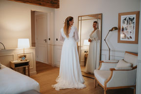 Le modèle Venise est confectionné en mousseline de soie, dont le tombé léger accompagne chaque mouvement avec douceur. Le buste est habillé de dentelle de Calais rebrodée, travaillée avec précision pour dessiner un décolleté élégant et apporter du relief à la silhouette. Cette dentelle se prolonge subtilement sur les épaules et le haut du dos, créant un jeu de transparence délicat.